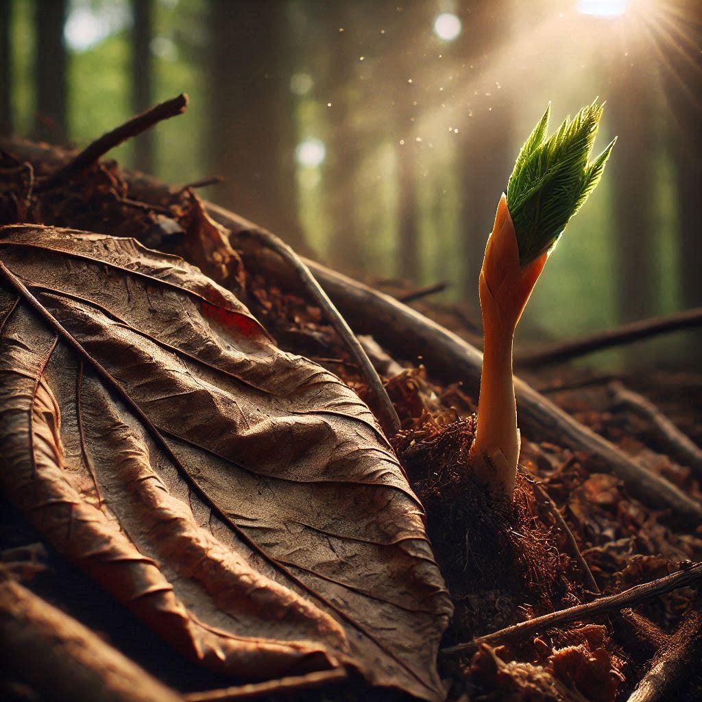 Poetry and MusingsForestClear Light: poetic wisdom for your ponderingAnya Sophia MannDec 31, 2024ShareForestStanding stilllooking upturning around in a circle.While standing stillI see all of the forestas my eyes reston a dried up wrinkled leafand beside it is the beginning of a new tree peeking up out of the ground of the growing forest.Text within this block will maintain its original spacing when published Anya Sophia MannText within this block will maintain its original spacing when published ShareLeave a commentThanks for reading Clear Light! Subscribe for free to receive new posts and support my work.Subscribe